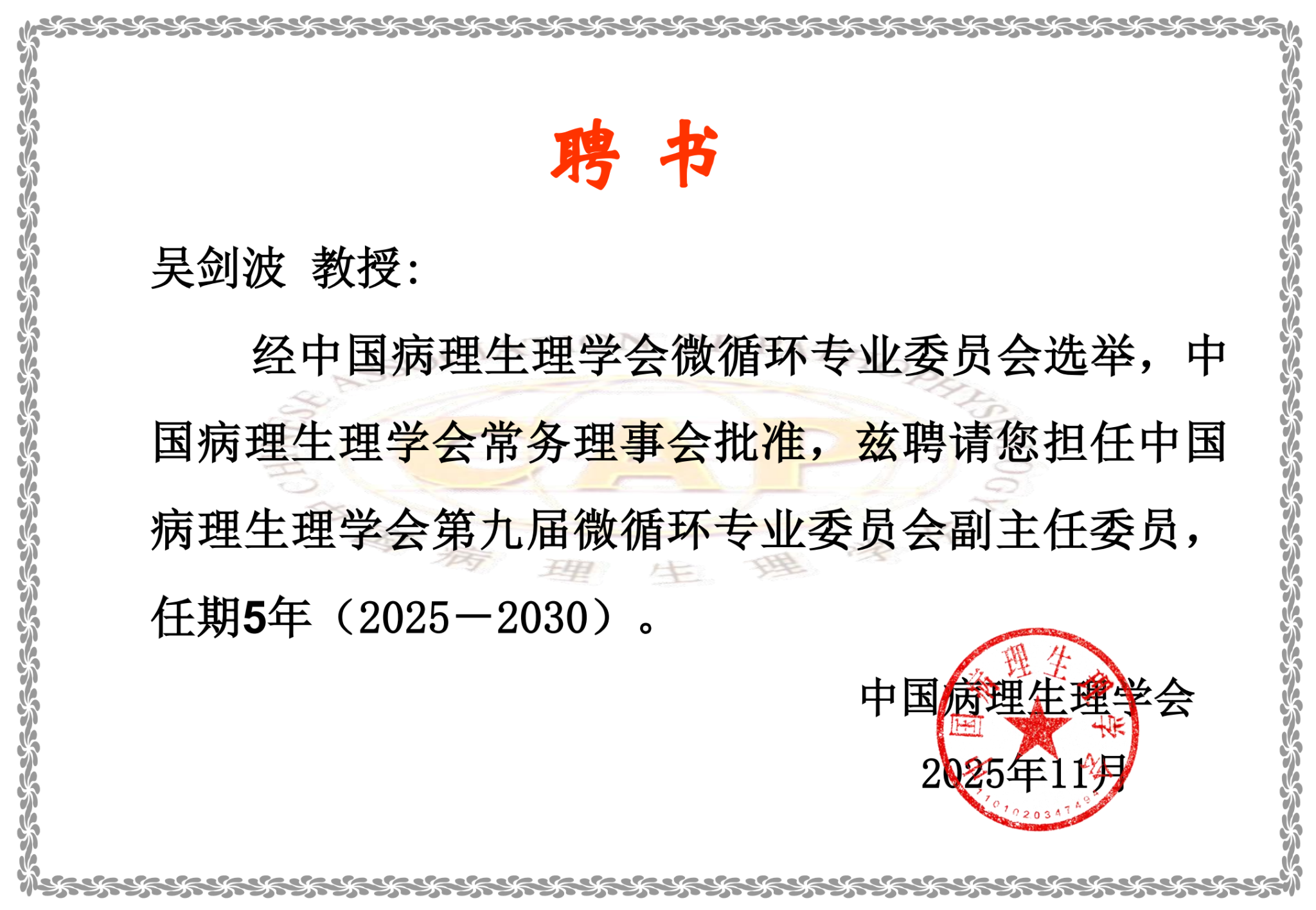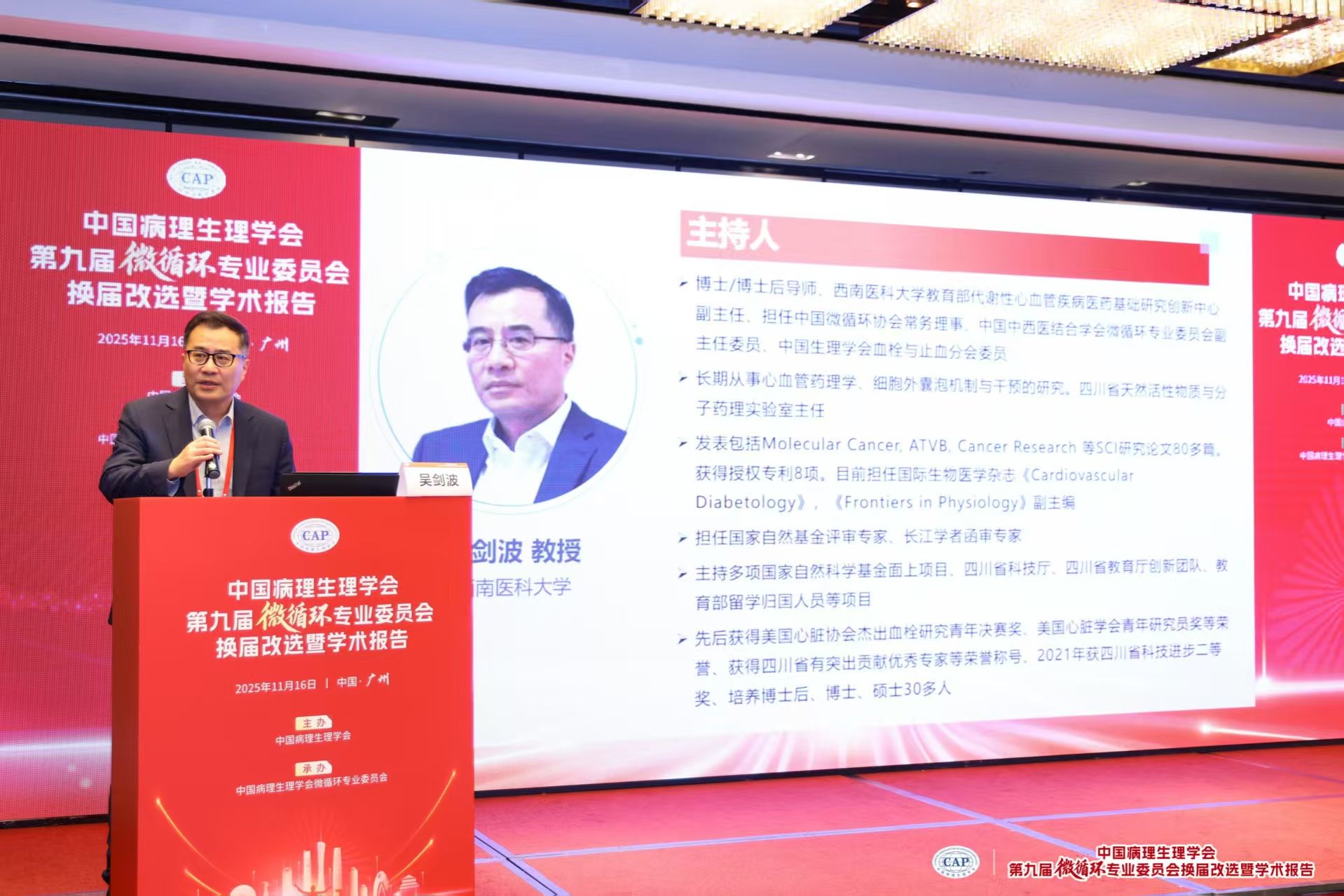在本次换届选举中,南方医科大学黄巧冰教授当选为主任委员,我校教育部代谢性心血管疾病医药基础研究创新中心吴剑波研究员当选为副主任委员。此次当选标志着我校在微循环领域的学术影响力与贡献获得了国内同行的广泛认可。